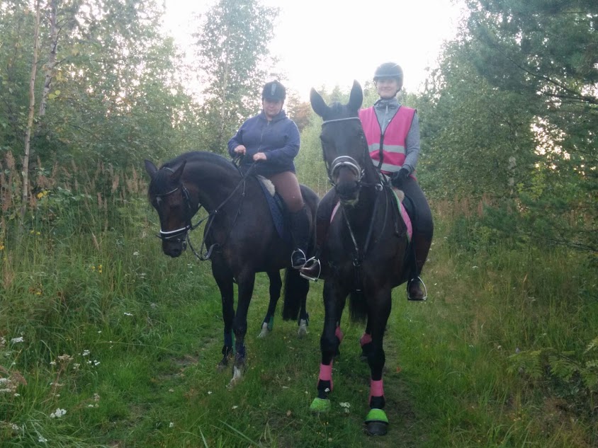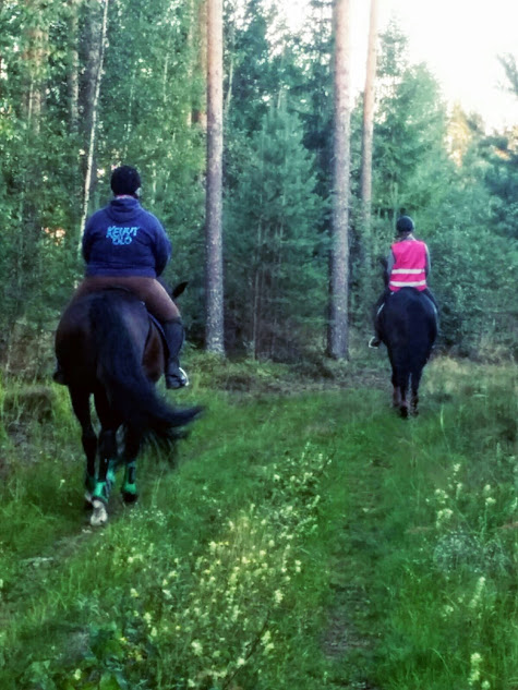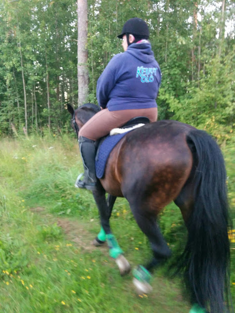 Lauantaina menimme Rian kanssa maastoon. Ria talutti ja minä ratsastin Reksillä... En ollut käynyt maastossa sen katastrofaalisen maaston jälkeen... Eli viime keväänä kävin Rekolla maastossa ja se päättyi huonosti... Hevoset eivät tulleet junaradan yli ja jouduimme kustsumaan Jennan kaa apujoukkoja... Mutta nyt maasto meni hyvin!!! Menimme Rian kanssa soramontuille ja siellä Ria sitten juoksutti minua ja Rekoa... Laukkasin, jopa... Kun lähimme takasin Landelle päin menin satulassa väärinpäin ja ilman jalustimia!!!